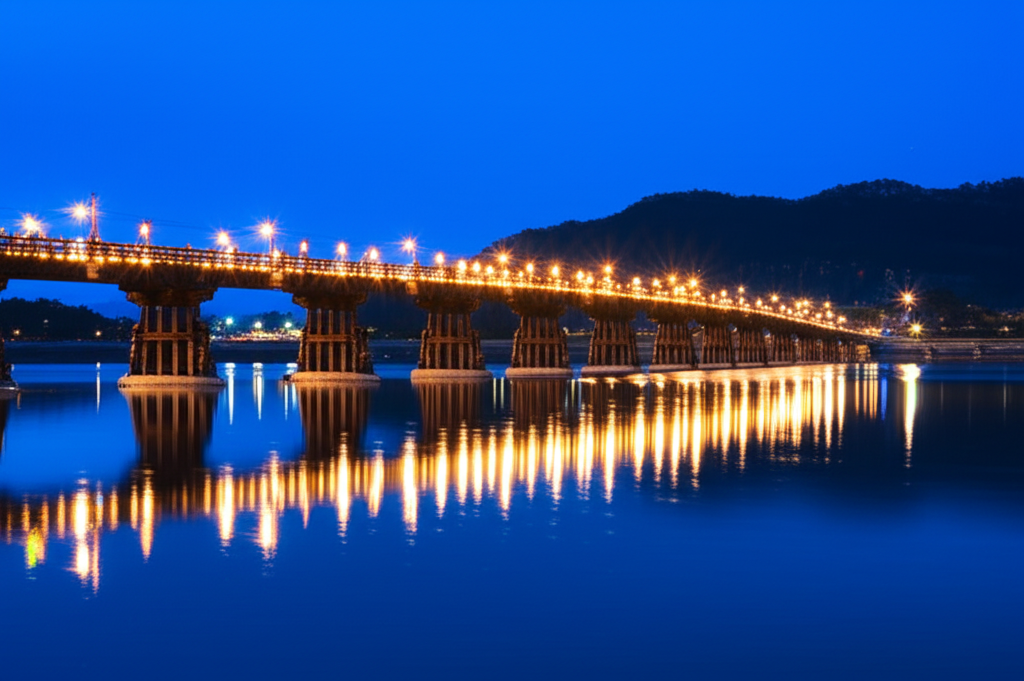 밤이 되면 안동은 또 다른 매력을 뽐냅니다. 그 중심에는 우리나라에서 가장 긴 목책 인도교인 월영교가 있습니다. 먼저 세상을 떠난 남편을 위해 아내가 머리카락을 뽑아 미투리를 지었다는 애틋한 사랑 이야기를 모티브로 만들어진 다리입니다. 화려한 조명이 켜진 월영교의 야경은 낭만 그 자체이며, 안동의 밤을 대표하는 상징적인 풍경입니다.